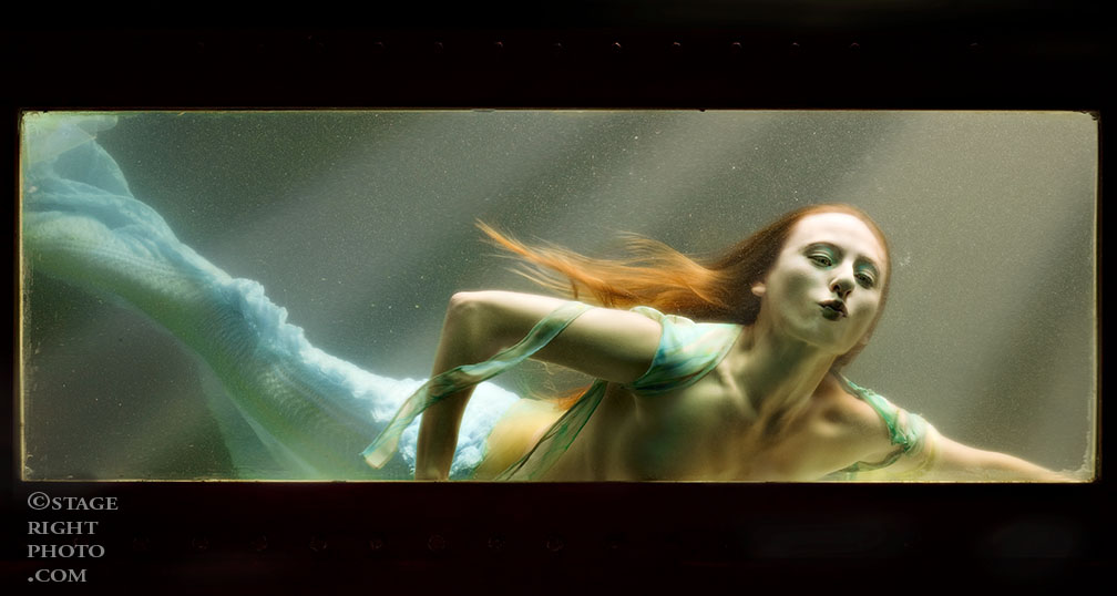 Within a day or two, I heard from my friend Tanya Burka, world renowned aerialist. “Hey Annaliese. I am going to be in town next week. I owe you some modeling. Do you have anything in mind?” Hmmmm… tank… gorgeous performing artist/contortionist… MERMAID! Tanya was more than game to be the first mermaid in the tank. I made my first mermaid tail from a scary old lace tablecloth, and my friend John Wenderoth, one of said genius creative makers in my neighborhood, and a handsome devil, helped set up the tank on a stand in my carport. Yep, almost all the mermaid images to date were made in the carport. As I told him about the shoot that was shaping up, he said, “I’ll get in the tank with the mermaid lady.” And, immediately I saw the whole story for the shoot. That first shoot was grueling. Technically, I was flying by the seat of my pants. Water, reflections, electricity, submerged subjects… but, the result was magnificent. The images from that shoot were the most beautiful things I had ever created. One is the cover of my web site, and another graces my business card (and serves as the final end papers for last year’s Spectrum Art book).