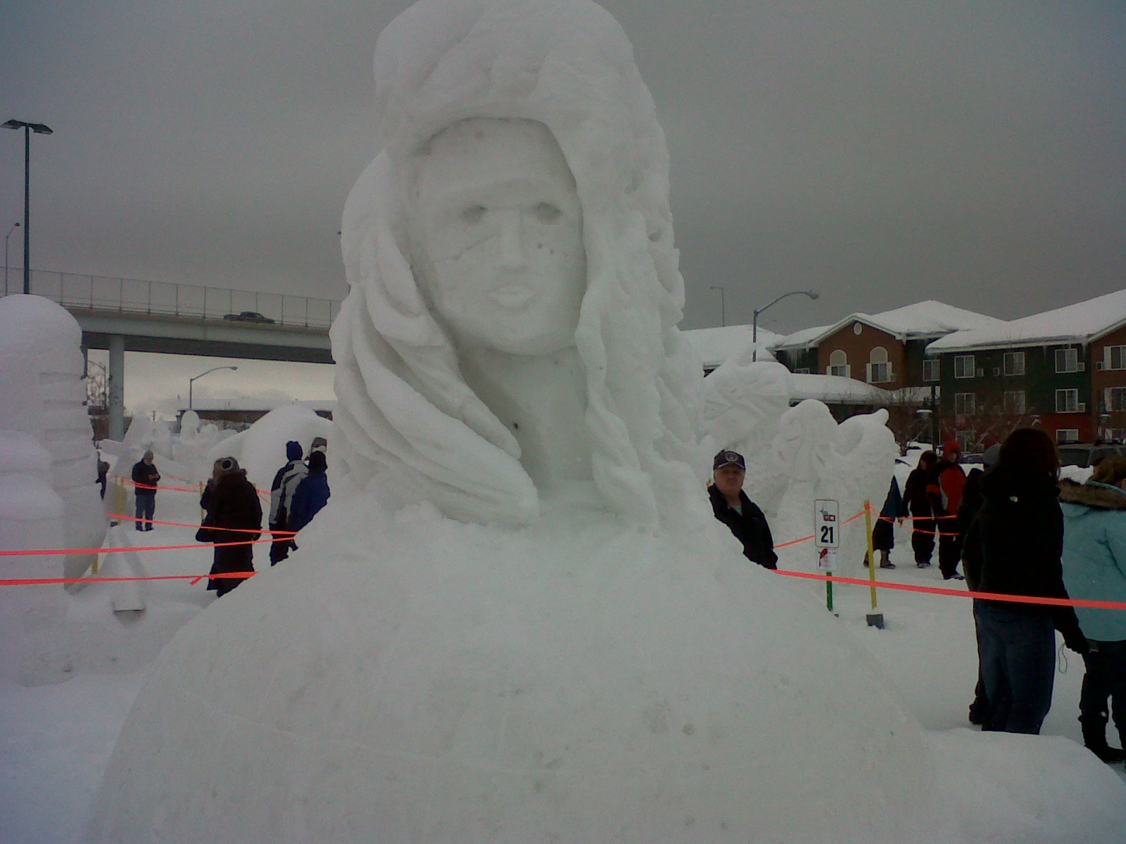 1) Please admire the MERMAID SNOW SCULPTURE below, from Anchorage, Alaska’s Fur Rendezvous Snow Sculpture Contest. I took these photos on my BlackBerry on Saturday in the snow, after watching the start of the IDITAROD, and I admit they are not the best quality. But still. On what other mermaid blog will you find such a glorious mermaid snow sculpture, even if it looks more like a Sphinx sitting atop an igloo?