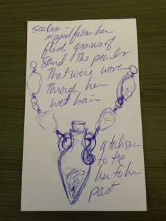 Artist Jenny Davies-Reazor, for example, imagined that in those last minutes before losing her tail, the mermaid might scrape off some scales, pluck a pearl or two from her tresses, and store them in the now-empty vial. She’d make herself a necklace that would forever remind her of the world she left behind: