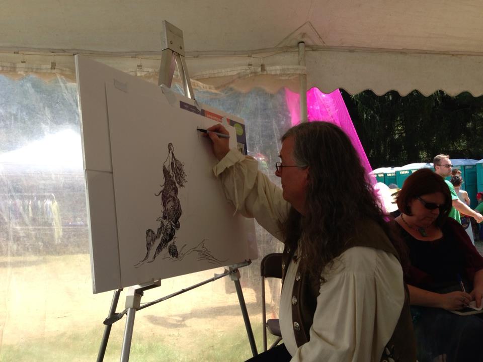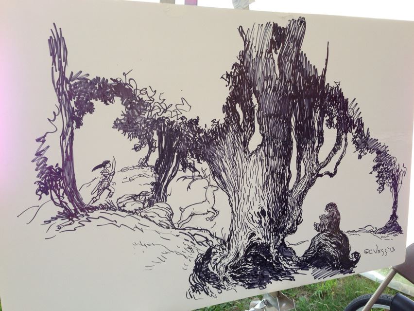 Charles and I were set to do two “Faerie Chautauquas” or talks together, Saturday and Sunday afternoons at 2. Originally, these Chautauquas were to also include Ari Berk and Gary A. Lippincott, so I figured I could let them do all the talking as I am very lazy. When Ari and then Gary ended up heartlessly abandoning us, it was down to Charles and me. Charles suggested that I read from one of my books while he drew the scene I was reading, so on Saturday I read from The Fairest of Them All, my novel that comes out in August, a scene of Rapunzel hunting in the forest in glamorous warrioress fashion. Here’s Charles’s illustration, done with magic marker on posterboard: