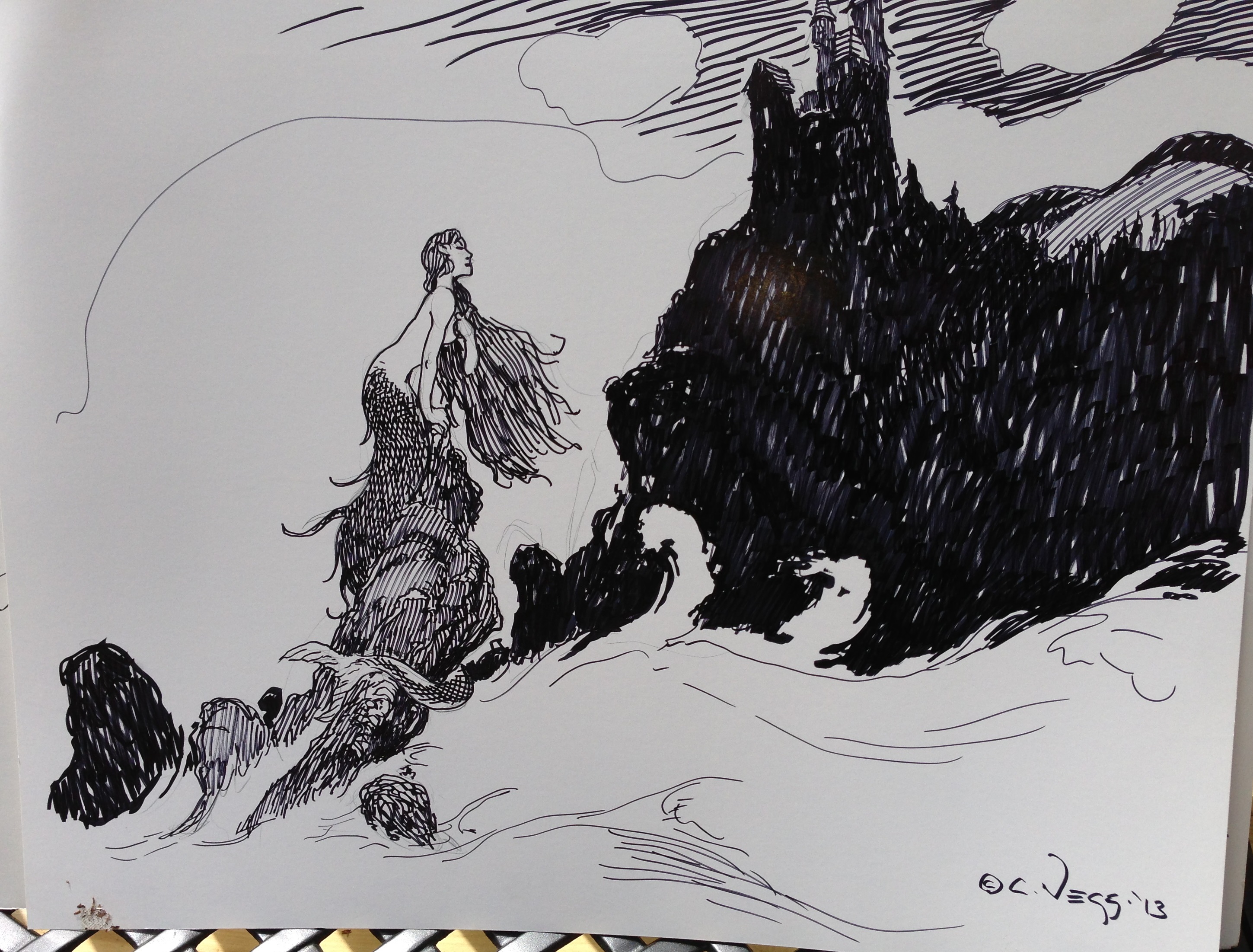 After I read, Charles continued to draw and I kind of just yammered on, with no plan and no end in sight. SO for the next day, I thought perhaps we might need a better plan and by “better plan” I of course mean mermaids. I suggested that we force the audience to participate, too, which is a tactic beloved by lazy people everywhere, and Charles suggested I end at a pivotal moment and let everyone else decide what comes next. So Sunday morning Charles and I made a glamorous visit to WALMART for pens and paper and posterboard, and that afternoon I read a scene from Mermaid, a few pages up to the moment when our mermaid drinks the sea witch’s potion and is about to turn into a human. All the while, Charles drew: